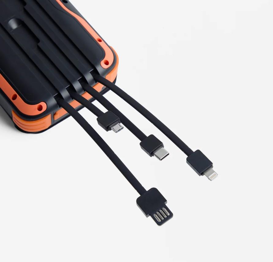 • Cables Incorporados: Tipo C, Lightning, Micro USB y USB A para cargar todos tus dispositivos sin necesidad de cables extra.