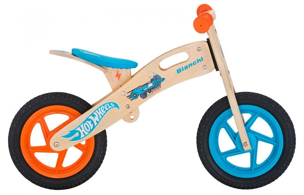Espectacular Bicicleta Infantil Bianchi pensada para iniciar a los más pequeños en este hermoso deporte. ideal para comenzar a desarrollar el equilibrio corporal del niño, ya que viene sin pedales y el desplazamiento es a través del uso de los pies o bien empujado por un adulto. En esta ocasión nuestro modelo Hotwheels  esta fabricado especialmente para niños, equipado con marco de madera, posee asiento ajustable, puños de goma y tapabarros