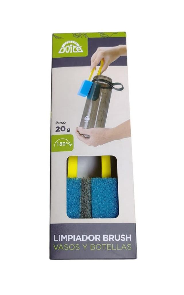 Limpiador de vasos y botellas Brush con esponja suave para limpieza delicada y otra cara con esponja dura y resistente para suciedad difícil.