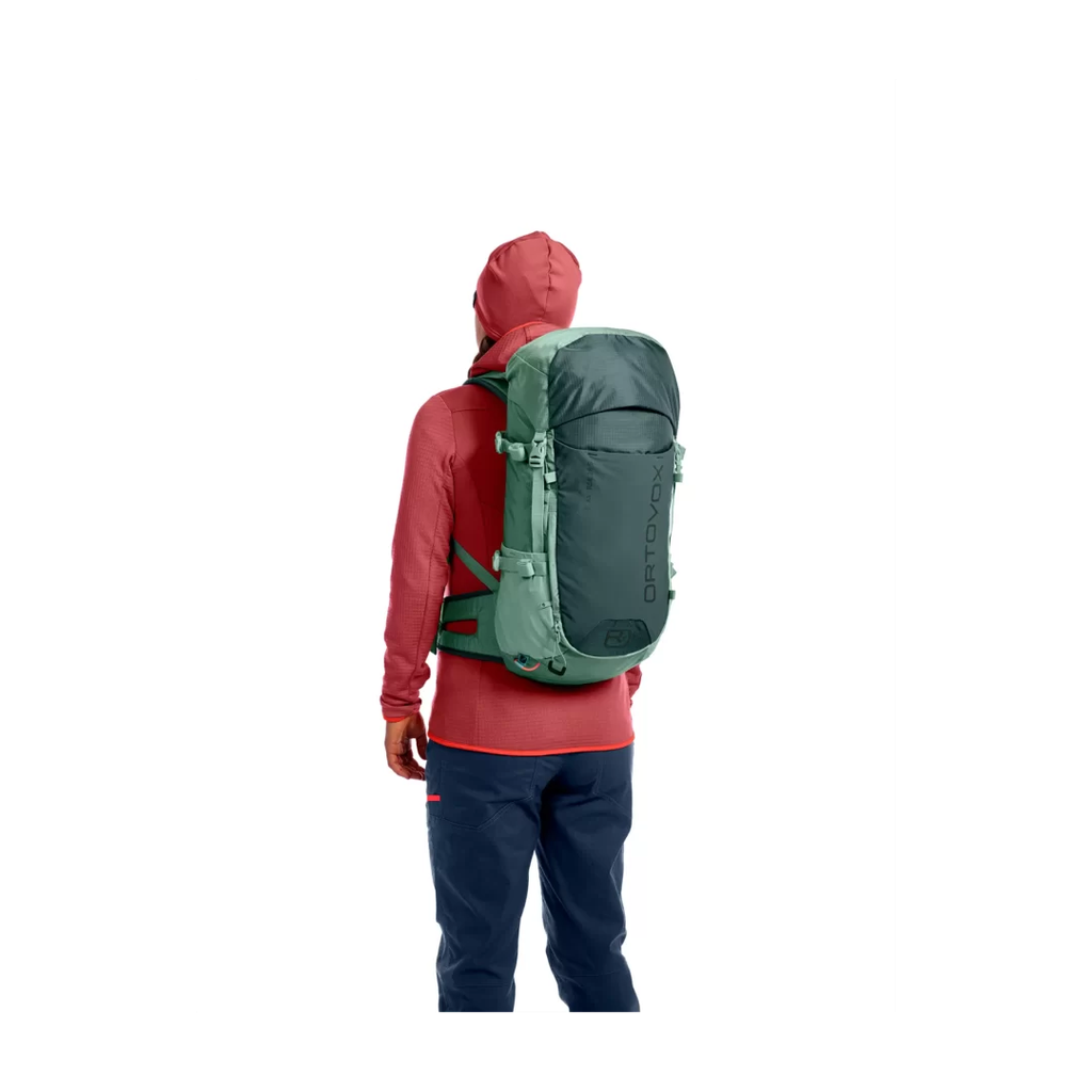 La mochila TRAVERSE 28 S es la más adecuada en excursiones de un día. Las correas de hombro de forma ergonómica y el ancho cinturón de cadera garantizan una distribución equilibrada del peso. Con su gran compartimento principal y varios compartimentos adicionales, esta mochila ofrece mucho espacio de almacenamiento para el equipo. Los objetos más pequeños pueden ser guardados rápidamente en el compartimiento de la ranura en la parte delantera, y su botella de beber siempre está a la mano en los compartimentos laterales elásticos. También se incluyen características tales como una cubierta para la lluvia y la sujeción del poste de senderismo, así como la compatibilidad del sistema de hidratación, un bolsillo de cadera y un soporte para gafas de sol en la correa para el hombro. El TRAVERSE 28 S está redondeado con imágenes de señales de emergencia Alpine en el interior.