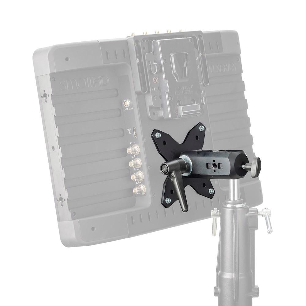 El soporte VESA cuenta con múltiples puntos de montaje de accesorios incorporados en el diseño, como un orificio roscado de 3/8" con orejetas antirrotación estilo Manfrotto y ARRI, un orificio roscado secundario de 3/8" para más accesorios y un orificio adicional de 16 mm (5/ Toma hembra de 8”), que permite su uso con accesorios esenciales como brazos de fricción y pequeños accesorios de soporte de iluminación para el montaje de receptores inalámbricos, flash o iluminación LED, dispositivos de audio o configuraciones de cámaras compactas.