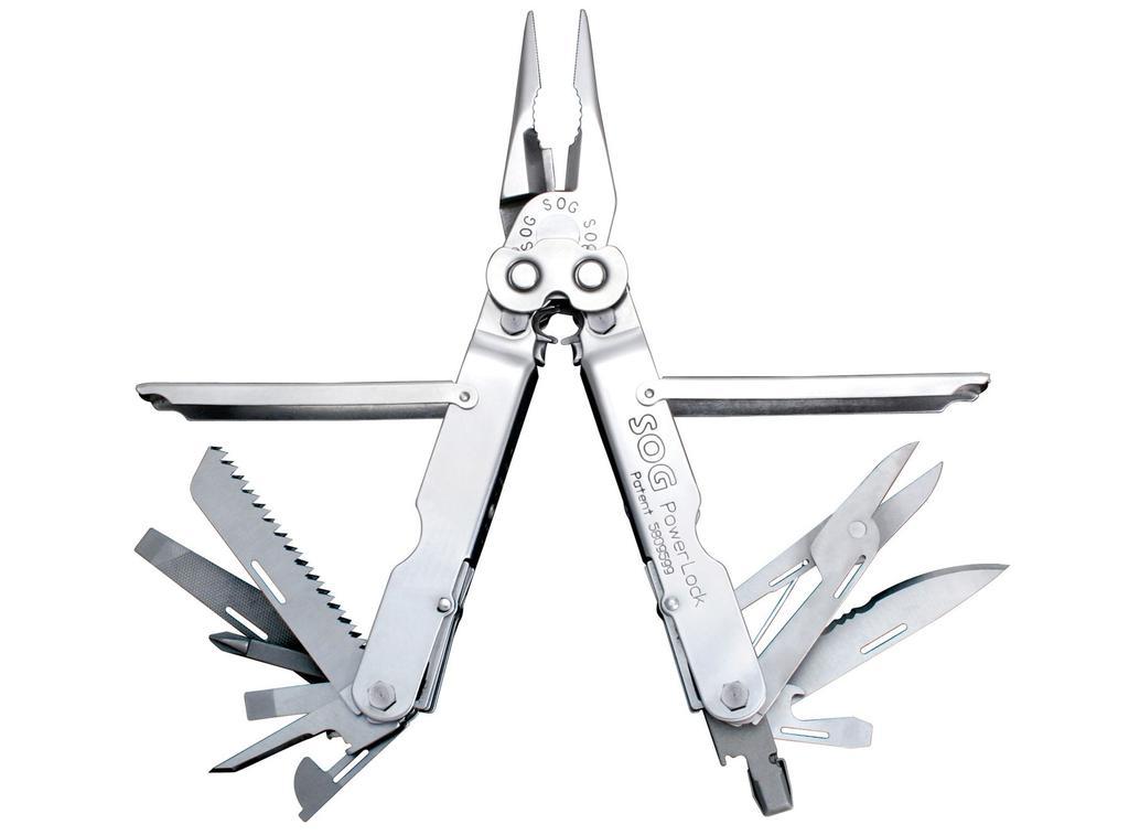 Funciones: Incluye alicates de punta fina, cortadores de alambre, cuchillas parcialmente dentadas, tijeras, rizadores, regla, abrelatas con destornillador fino, abrebotellas con destornillador, accionamiento de 1/4 ", destornillador Phillips, sierra para madera, lima fina / gruesa, punzón, destornillador grande y pestaña de cordón.