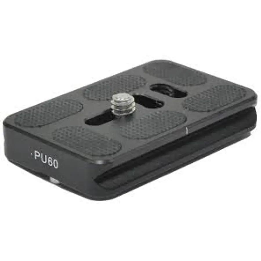 PU-60 placa de liberación rápida (50 x 38 mm) con superficies superiores de goma, tornillos de tope de seguridad para evitar que accidentalmente se caiga de la abrazadera suelta, y un estándar de 1/4 «-20 de cámara / lente con un tornillo de 5/32» cabeza de torque superiores.